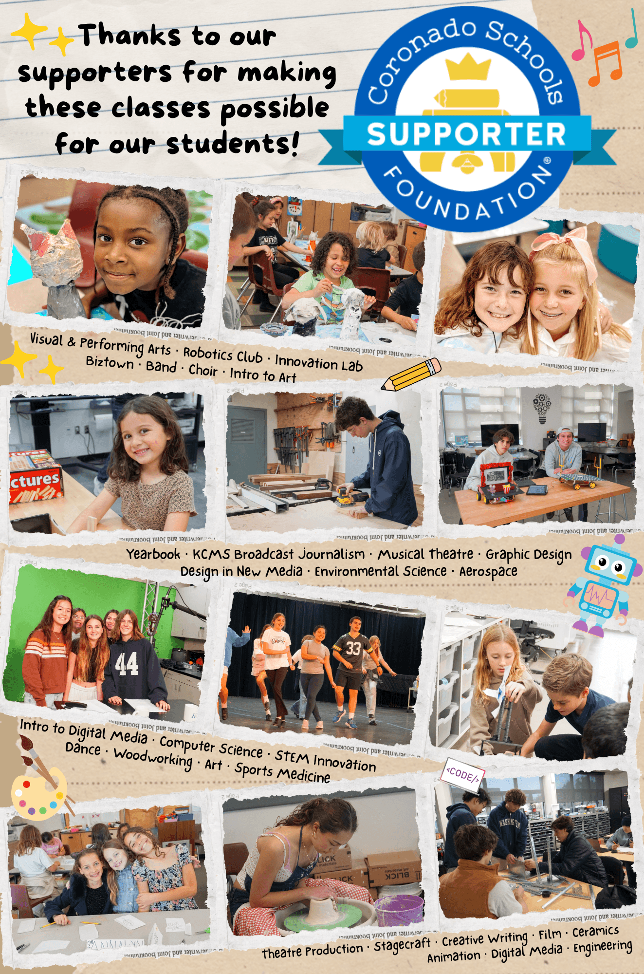 As fortunate as we all feel to live and attend schools in Coronado, we MUST raise funds annually to supplement the State’s funding to CUSD. CSF relies on donors like you to help fund cutting edge learning opportunities in STEM and the ARTS. Through these donations, we fund all the classes that make school cool! Does your student like Art? Science? Choir? Robotics? Yep, all funded by CSF. Without CSF, these classes would not exist!